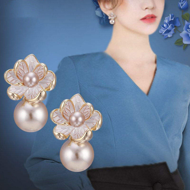 European and American Enamel Pearl Earrings French Versatile Big Pearl Earrings Gold Code-193b