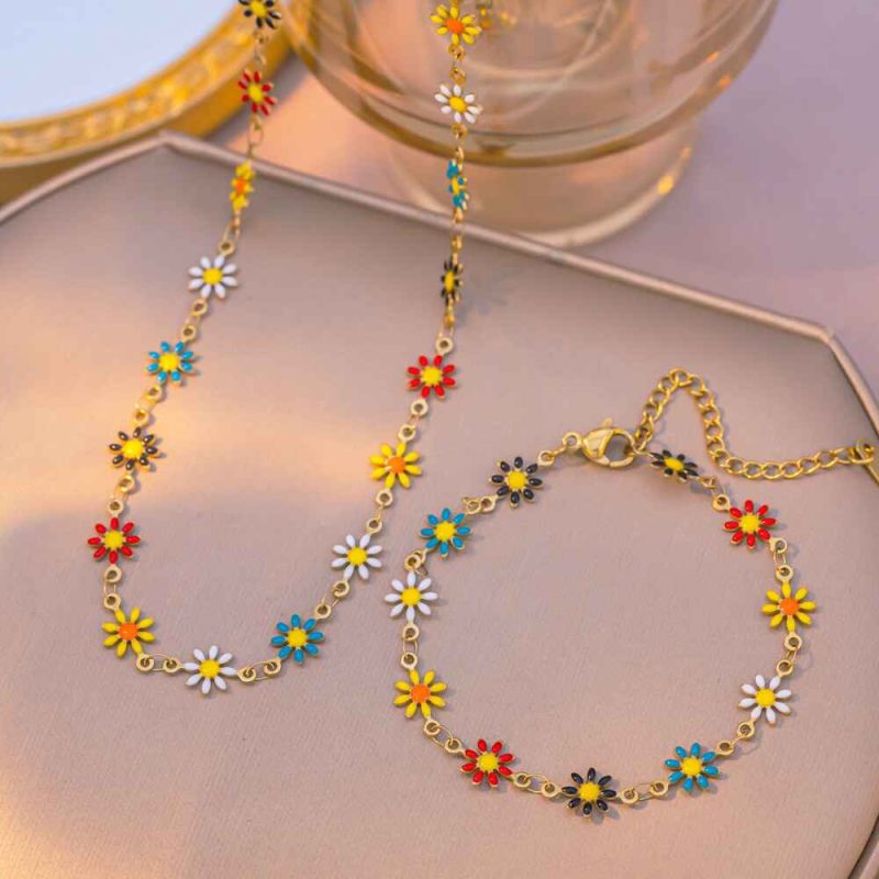Stainless Steel Gold Plated Dainty Flower Chain & Link Bracelet Colorful Daisy Charm Code-269