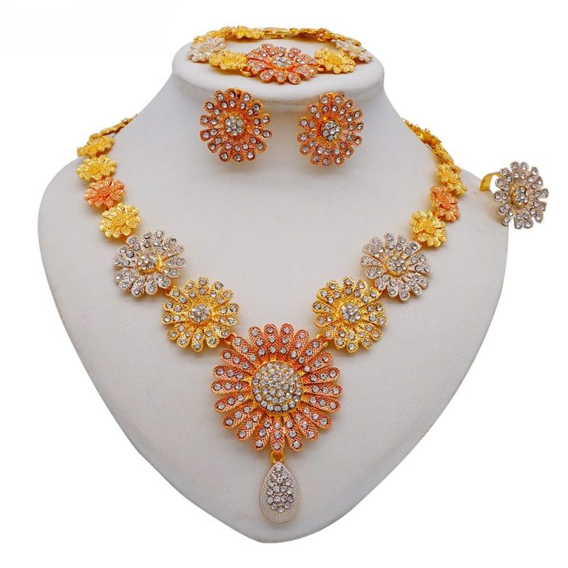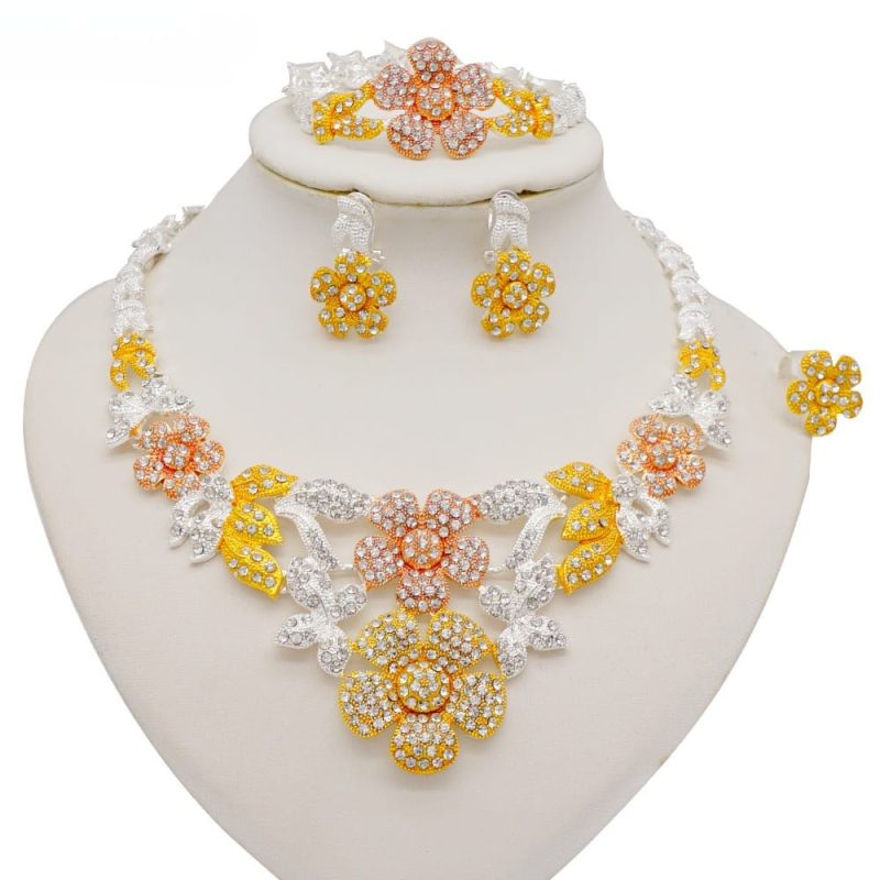18k Gold Plated Luxury Women Jewelry with Stones Necklace Earrings Ring Bracelet 4 Pieces Set Code-211