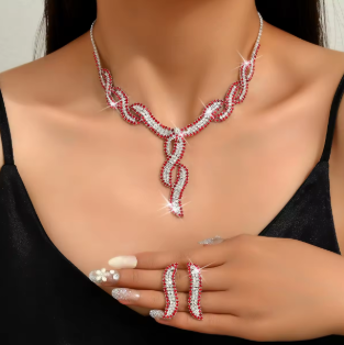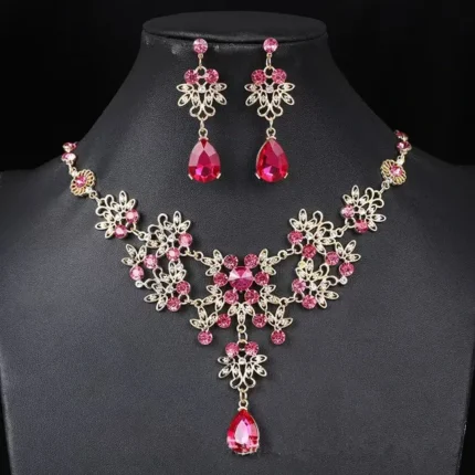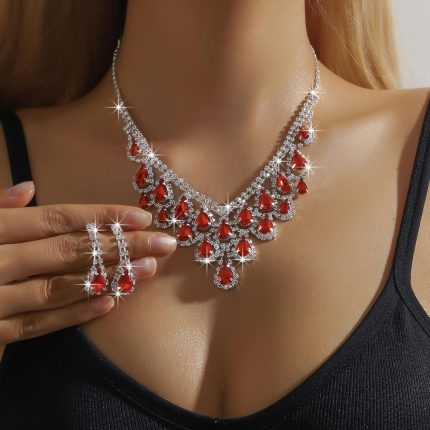 Crystal Glass Rhinestone Bridal Wedding Necklace Earring Jewelry Set Red Code-276a