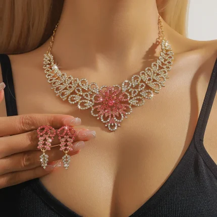 Crystal Glass Rhinestone Bridal Wedding Necklace Earring Jewelry Set Pink Code-276b