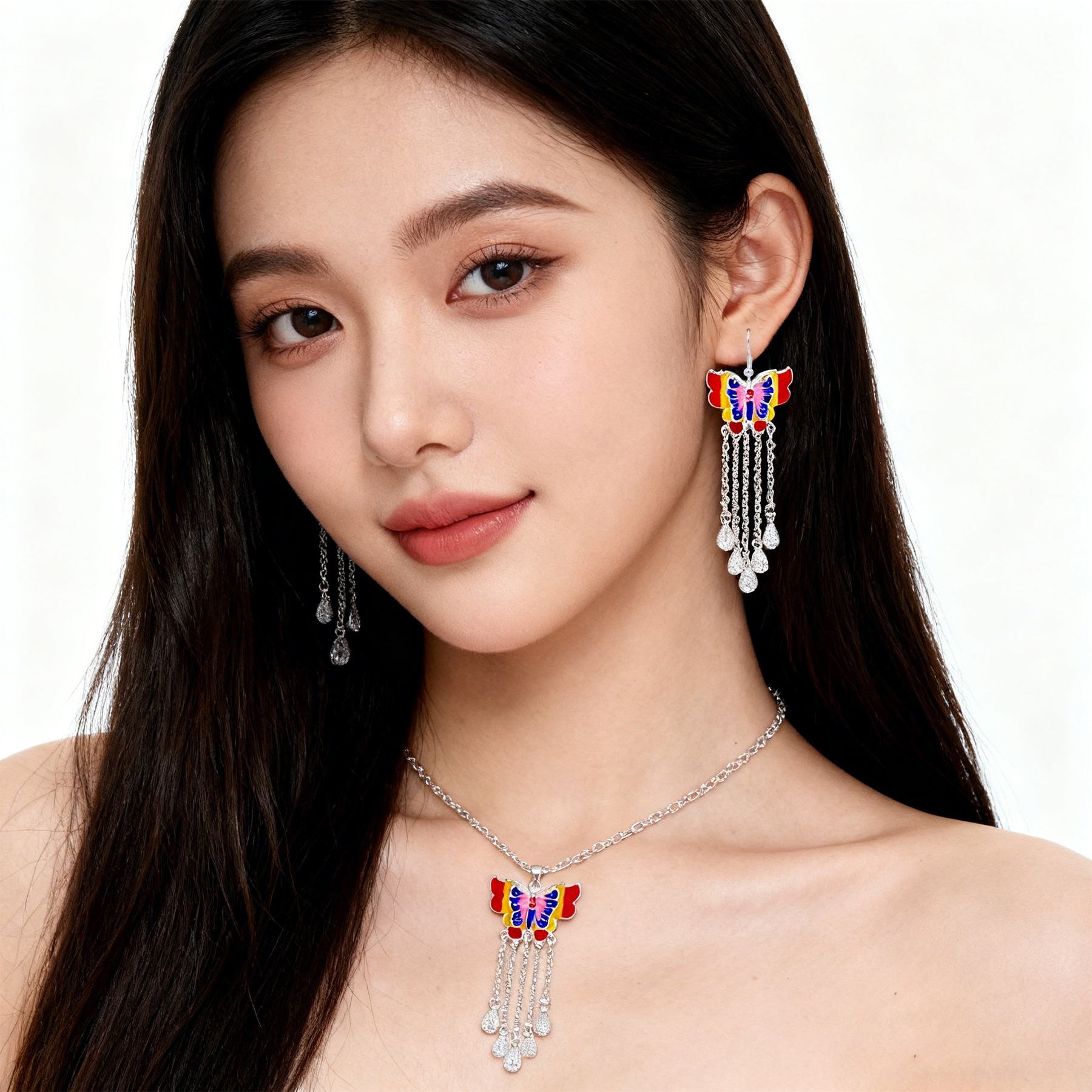 Bohemian Colorful Butterfly Long Tassel Earring & Necklace Set Red Code-246b