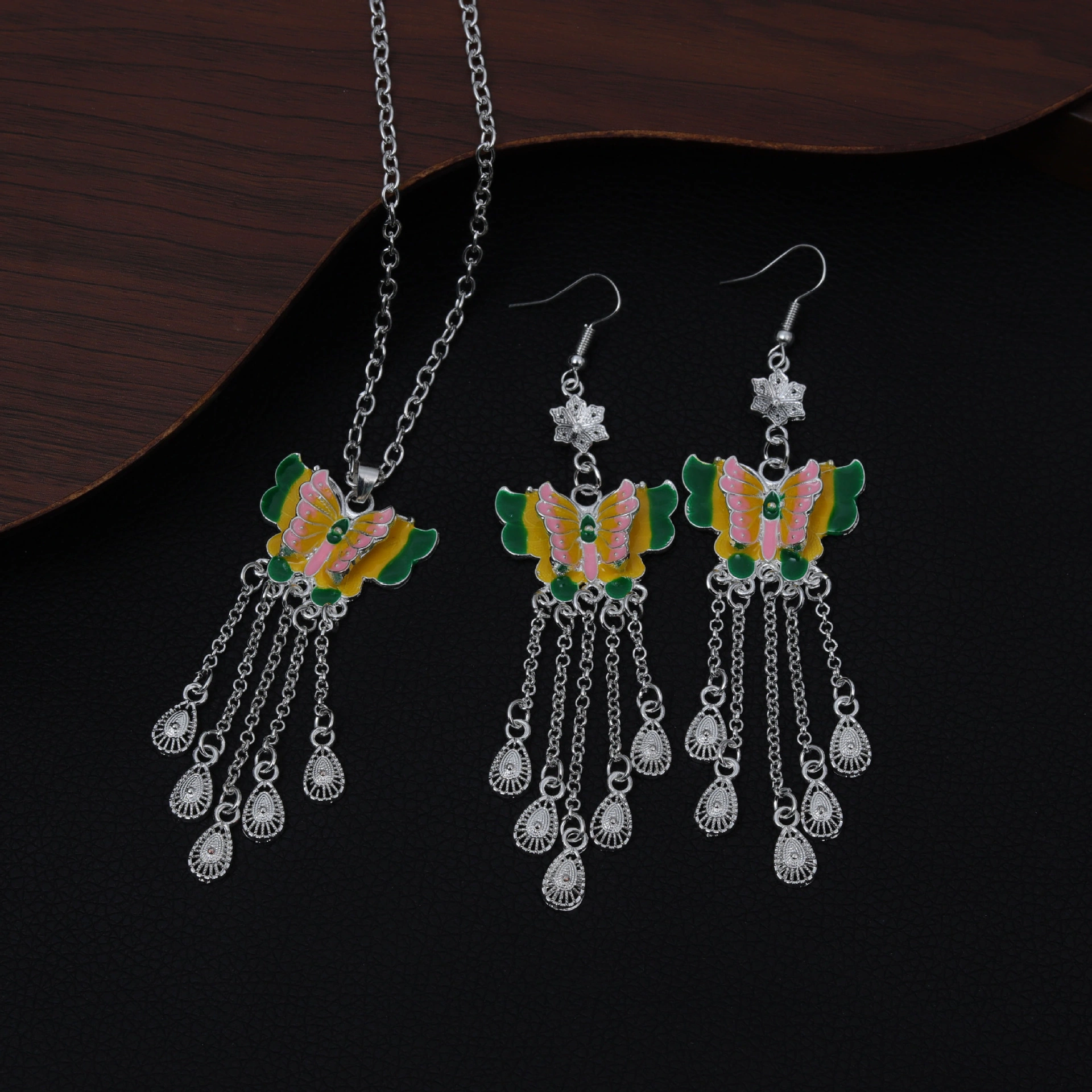 Bohemian Colorful Butterfly Long Tassel Earring & Necklace Set Yellow Code-246c