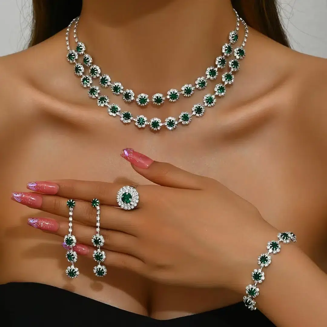 Full Diamond Double Layered Green Crystal Necklace and Earring Bracelet Ring Set Code-129